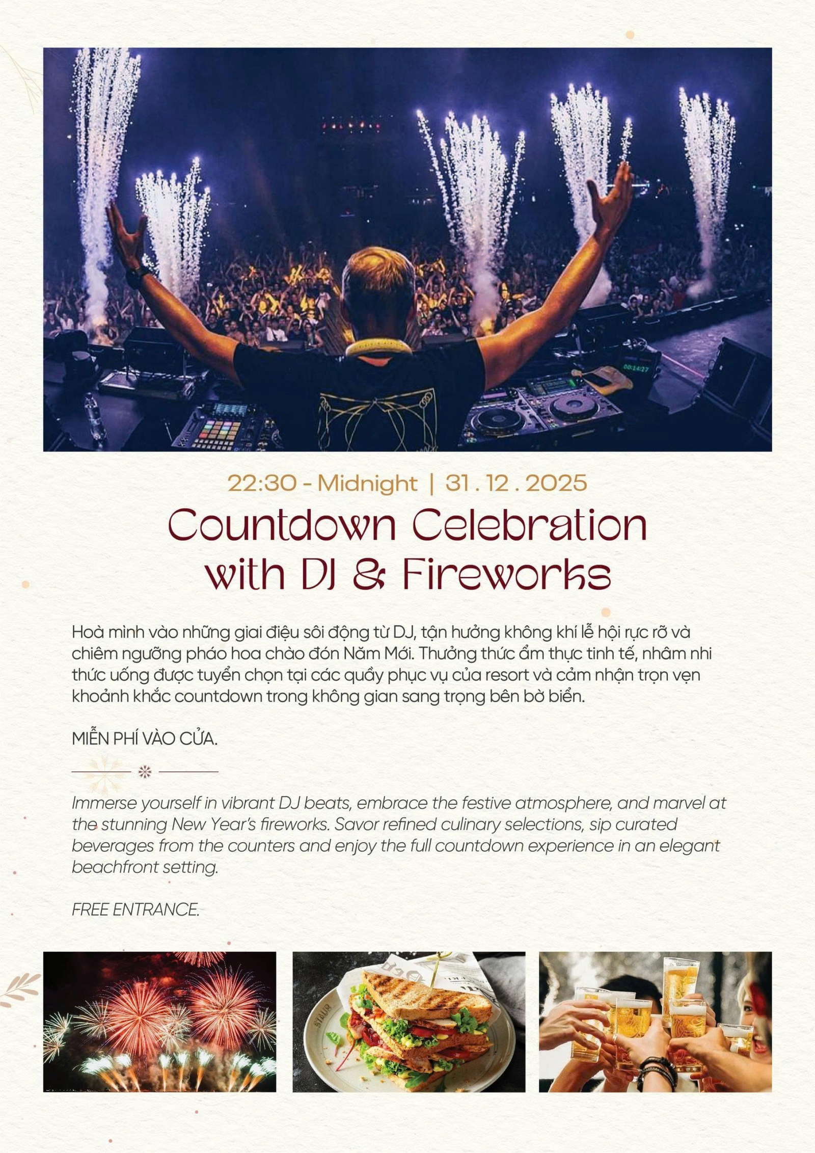 Liên hệ ngayHoà mình vào những giai điệu sôi động từ DJ, tận hưởng không khí lễ hội rực rỡ và chiêm ngưỡng pháo hoa chào đón Năm Mới. Thưởng thức ẩm thực tinh tế, nhâm nhi thức uống được tuyển chọn tại các quầy phục vụ của resort và cảm nhận trọn vẹn khoảnh khắc countdown trong không gian sang trọng bên bờ biển.