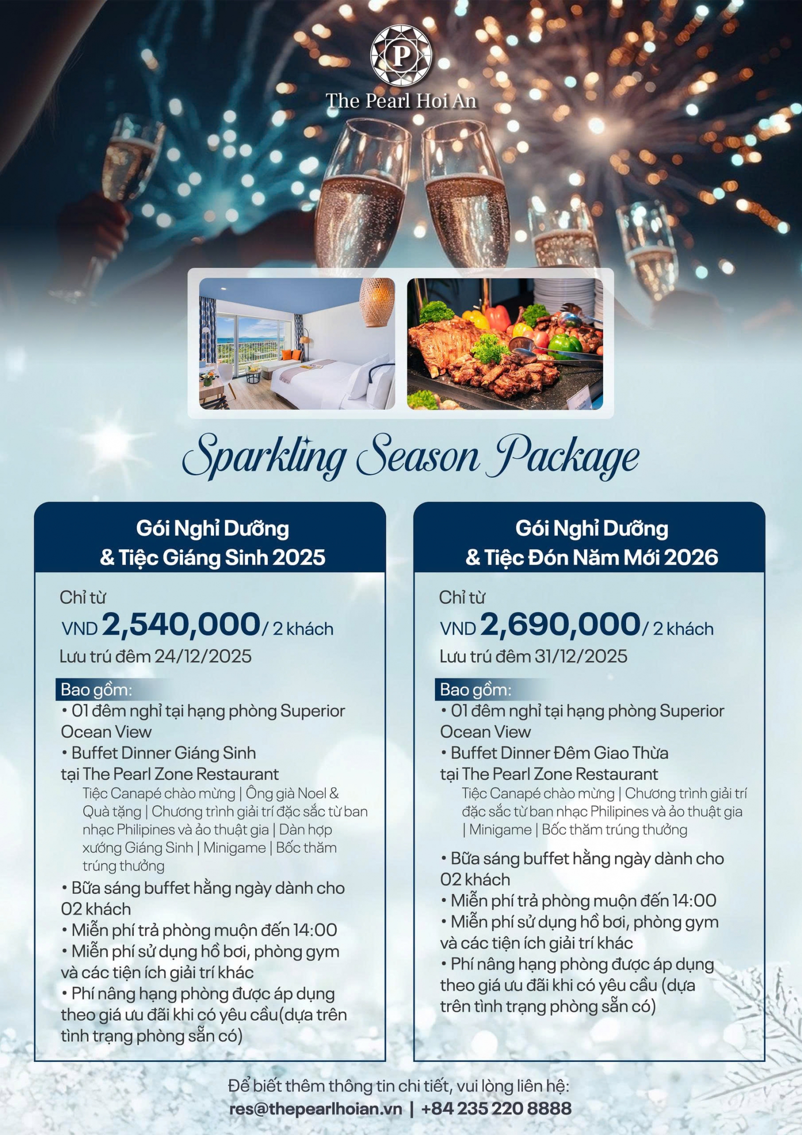 Liên hệ ngayHòa mình vào không khí lễ hội rực rỡ cuối năm cùng Sparkling Season Package – gói nghỉ dưỡng kết hợp tiệc lễ hội đặc biệt tại The Pearl Hoi An. Đây là lựa chọn lý tưởng để bạn và người thân tận hưởng Giáng Sinh ấm áp hoặc đón năm mới 2026 trong không gian sang trọng, ẩm thực đặc sắc và những khoảnh khắc đáng nhớ.
