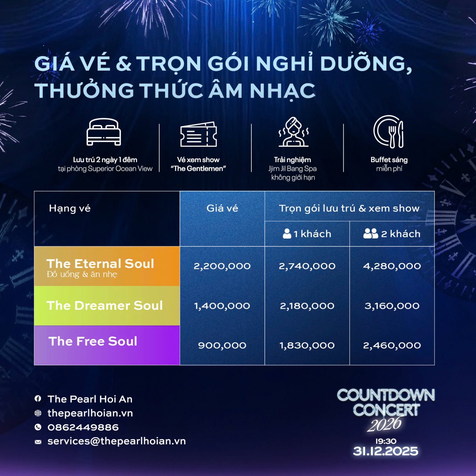 Để mang đến những trải nghiệm trọn vẹn nhất, The Pearl Hoi An giới thiệu ba hạng vé đặc biệt cho đêm nhạc “THE GENTLEMEN – Countdown Concert 2026”. Mỗi hạng vé là một cung bậc cảm xúc, một cách tận hưởng âm nhạc riêng dành cho những tâm hồn yêu cái đẹp.
